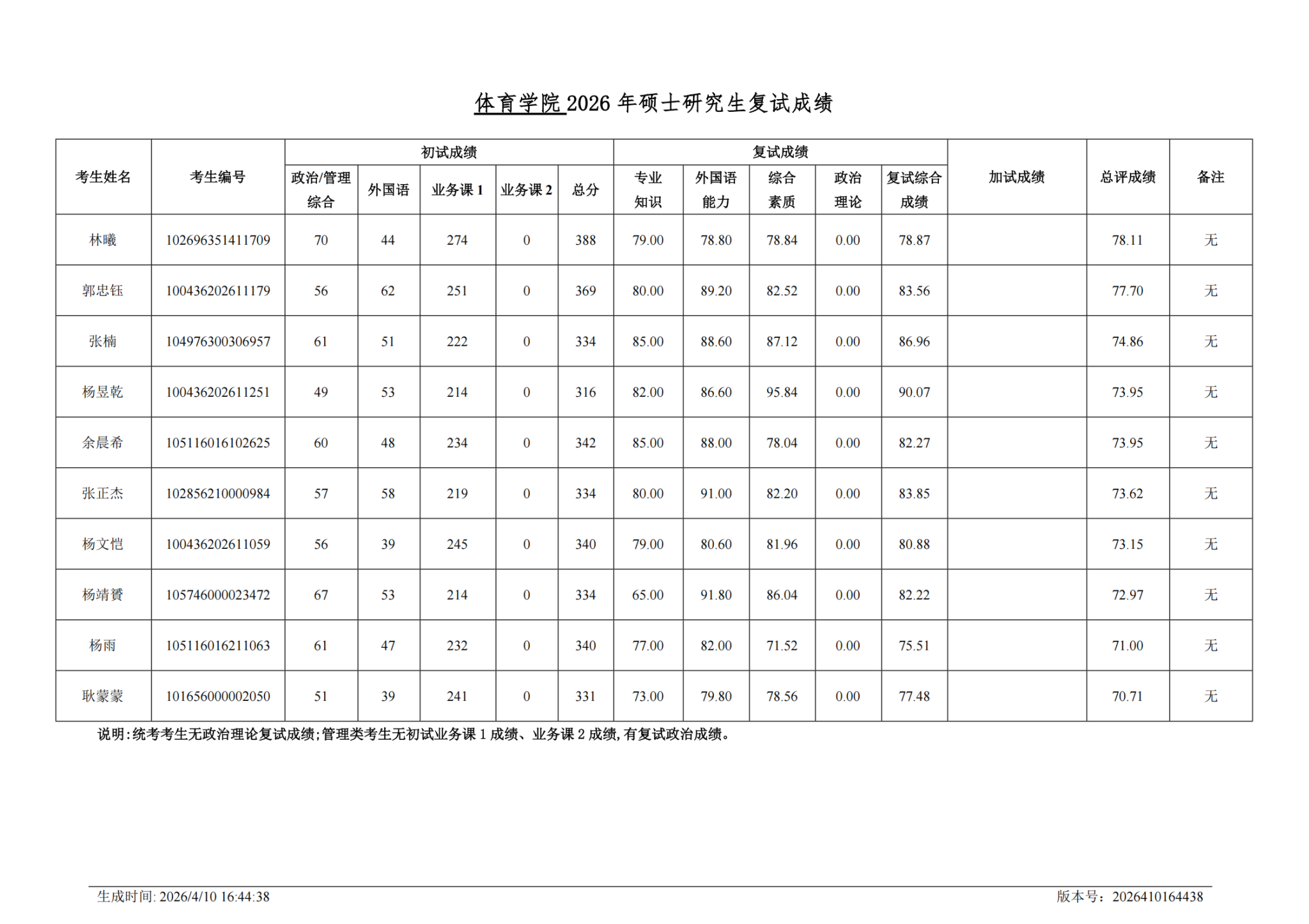 OD体育2026年硕士研究生复试成绩(调剂)